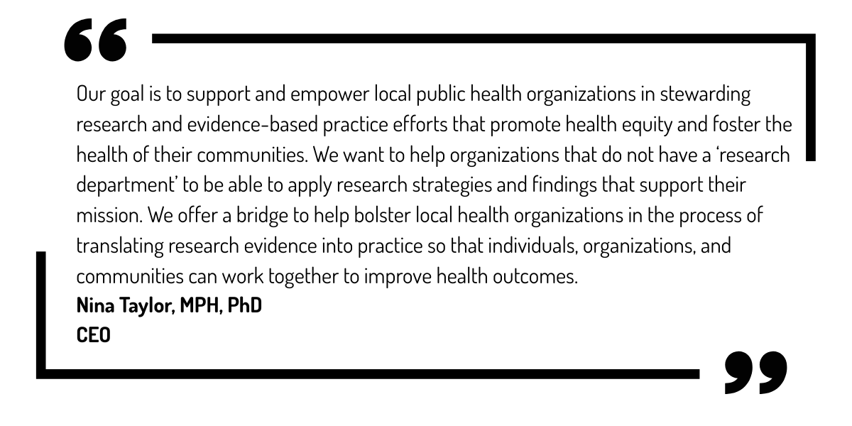 Working Together for Health Equity Our mission is to improve the translation of research findings and innovations into public health practice by offering tailored research support services accessible to community-based public health organizations. Learn More Join Our Newsletter Sign up to our monthly newsletter to receive updates about our upcoming projects and volunteer opportunities.